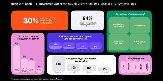 «Яндекс.Дзен» провёл опрос среди 3 400 пользователей платформы и выяснил, что любимое увлечение есть у 80% опрошенных. А какое ваше любимое увлечение? И зачем вы им занимаетесь?