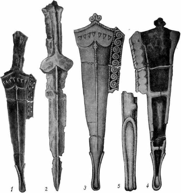 62). В сентябре того же года, при осмотре места находки на склоне, который сильно размывается дождевыми водами, нами было обнаружено несколько фрагментов железных наконечников копий, обломки сосудов и остатки костей человека. Кинжал (рис. 62—2) обломан в двух местах. Общая длина его 31 см, длина клинка 22,5 см, рукоятки 8,5 см. На рукоятке с обеих сторон имеется по два узких продольных паза, по-видимому, для прикрепления планок, на вершине ее (в средней части) — продольный выступ (наполовину обломан), служивший для надевания навершья. Рукоятка заканчивается перекрестием в виде крыльев бабочки. Концы перекрестия, общая ширина которого равна 5,1 см, выступают из-под рукоятки на 1,5 см, а по отношению к клинку — примерно на 1 см. Клинок со срединным сильно выделяющимся с обеих сторон ребром; прямые лезвия, суживаясь к острию, придают оружию треугольную форму, характерную для кинжалов так называемого скифского типа. Бронзовые ножны (рис. 62—3—5), благодаря высокому мастерству и художественности оформления, представляют большой научный интерес. Аналогичные изделия пока остаются неизвестными и в районах распространения колхидско-кобанской бронзы и на территории всего Кавказа. Разломанные, как и кинжал, в двух местах ножны, длиной 28 см, имеют треугольную форму и заканчиваются овальным расширением, окантованным валиком. Валики с лицевой и тыльной сторон сделаны в форме петель, а с боков (рис. 62—5) напоминают продолговатые листки. Ножны богато и разнообразно орнаментированы. Широкое основание их украшено рельефным изображением, напоминающим раскрытые крылья бабочки, как и на самом кинжале. Концы перекрестия (наибольшая ширина его 6,5 см, наименьшая 5 см) выступают по бокам треугольных линий ножен до 6 мм. Верхний край перекрестия окантован рельефным витым шнуром; средняя часть, выдаваясь, заканчивается рельефным изображением очкообразной привески. По ширине средней части расположены в один ряд семь треугольных углублений, по-видимому, заполненных ранее какой- нибудь цветной массой. Треугольники — равнобедренные, обращенные вершинами вниз. По оси ножен расположена рельефная полоска с поперечными насечками, имеющая ромбовидную головку, которая упирается вершиной в вырез нижней части перекрытия ножен. На этой головке маленькими ямочками, расположенными симметрично, обозначены два глаза. Рельефная полоска, постепенно суживающаяся к концу и завершенная ромбовидной головкой с глазками на ней, напоминает змею. К правому боку ножен прикреплена пластинка шириной в 2 см и длиной 10 см; вдоль нее посередине расположены четыре одинаковые, соприкасающиеся друг с другом, рельефно выделенные спирали, обрамленные с двух сторон продольным рельефным кантом, похожим на витой шнур. Боковые края ножен, загнутые в тыльную сторону на 0,5 см, образуют почти по всей длине просвет в форме равнобедренного треугольника, высотой 24 см и с основанием в 4,5 см. Загнутые края в трех местах переходят в узкие, сходящиеся на середине пластинчатые полоски различной ширины, из которых самая верхняя обломана. Эти края и поперечные полоски служили, несомненно, для закрепления в просвете деревянной вставки. Ножны покрыты зеленой патиной. В результате окисления поверхности некоторая часть орнамента частично разрушена. Изучение орнамента на ножнах — треугольные углубления, изображен