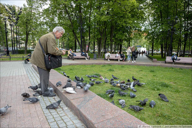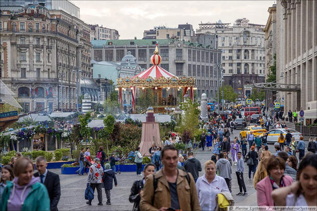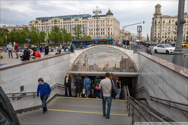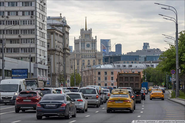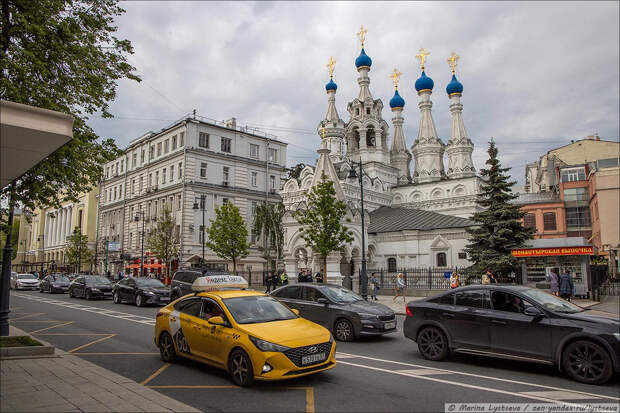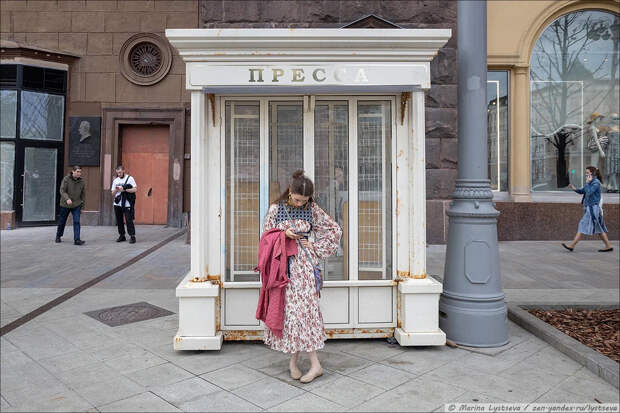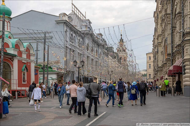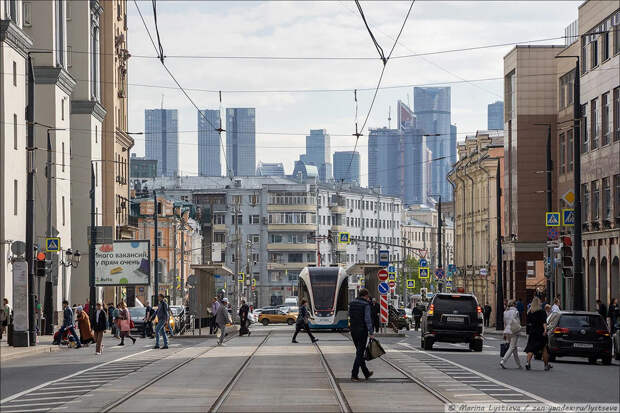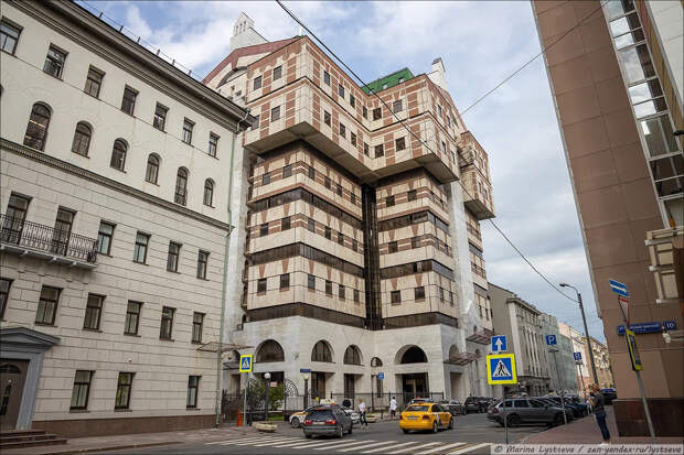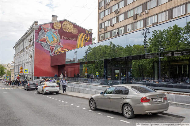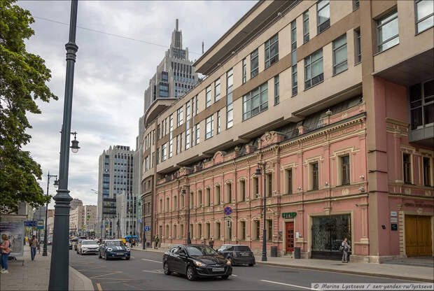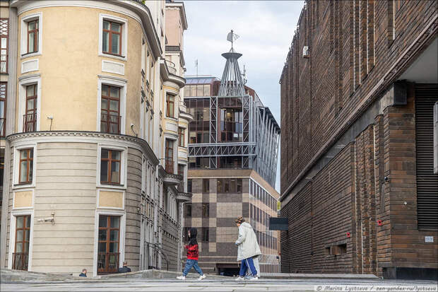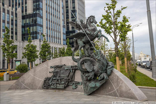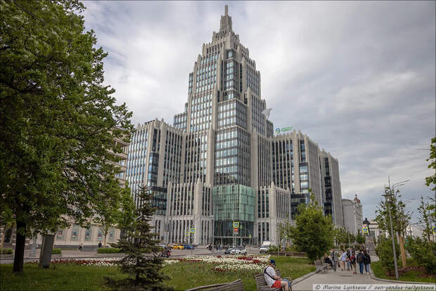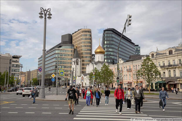метров, который явно выбивается по высоте из общей застройки: Площадь у Белорусского вокзала полупустая — парковка стоимостью 380 р./час не очень привлекает автомобилистов: На пересечении Ленинградки и ТТК заканчивают отделку очередного «зуба-высотки» — апарт-комплекс Alcon Tower: Переходим 1-ю Тверскую-Ямскую по наземному переходу (ждать 2 минуты) в сторону бизнес-центра около Никольской старообрядческой церкви, которая прекрасно вписалась в современную архитектуру: Храм московской епархии РПЦ чудом сохранился, когда в 30-е годы прошлого века повсеместно сносили церкви. Строительство начали в 1914 году, освятили в 1921. Вид на сити с Лесной улицы: По Тверской решили не идти — чего мы там не видели? Следуем параллельными «огородами» через улицу Александра Невского мимо скульптурной группы, посвящённой писателю Фадееву и «Молодой гвардии»: По пути встречается любопытное выделяющееся и нависающее над улицей здание Национального Общества Нейрорадиологов, построенное в конце 90-х, когда лепили постройки «кто во что горазд» в стиле «как захватить побольше площади»: Впрочем, допускаю, что лет через 20 оно будет смотреться довольно мило: Переходим Садовую-Триумфальную (кольцо) в районе «Дома музыки»: И попадаем в Садово-Триумфальный сквер. Всё цветёт и пахнет… Трое старых «ламповых зубов» около Маяковки внутри Садового кольца: Не знаю, как вам, а я считаю, что «Оружейный» — самая некрасивая московская высотка: Про памятник без комментариев^ На Малой Дмитровке пример дикой лужковской застройки — в этом доме XIX века жил поэт Алексей Плещеев. В 1991 году дом был внесен в список памятников культуры, а в 1997 году власти разрешили приватизировать здание: мэр отдал эту землю Школе телевизионного мастерства Познера. Возле строящегося здания проходили акции протеста, но в итоге старинный дом «реконструировали», оставив лишь стены центрального фасада, который оказался «замурован» в новой постройке: В то же время на площади Курского вокзала висел билборд с портретом Познера: «Я люблю Москву, которой почти больше нет: тихую, старую, со скрипом снега под ногами». Неизвестные приклеили к рекламе подпись: «пи$деть — не мешки ворочать, Володенька. Дом №20 по Малой Дмитровке». Церковь Рождества Пресвятой Богородицы в Путинках 1649 г. постройки является одной из последних крупных шатровых храмов в истории русской архитектуры. На Пушкинской стабильность — автозаки с тёплыми туалетами ждут гостей. Макдачная без опознавательных знаков стала просто куском стекла. А могли бы хоть туалет оставить… Есть чем гордиться… Скамейки на Тверской являют собой бетонный блок, обшитый деревом — такие стали ставить около подземных переходов после того, как на «Славянском бульваре» автобус влетел в переход, передавив кучу народа. Красивое панно в переходе показывает старую Москву. Вся пресса теперь в интернете. Дяденька кормит голубей булкой в Новопушкинском сквере: Возле пафосного ресторана «Турандот»: Бизнес-центр «Вознесенский» в Большом Гнездниковском: Сквер Муслима Магомаева: Англиканский собор Святого Андрея в Вознесенском переулке — единственная англиканская церковь в Москве, построенная в стиле викторианской готики во второй половине XIX в. Богослужения проходят только на английском языке: Собор был освящен в 1885 году в честь святого апостола Андрея, святого пок