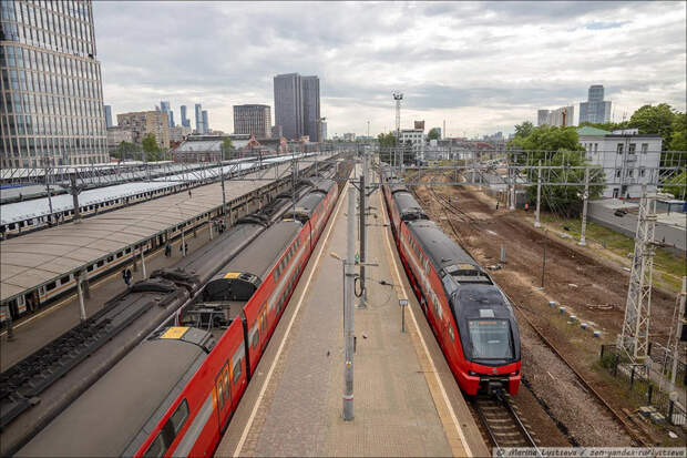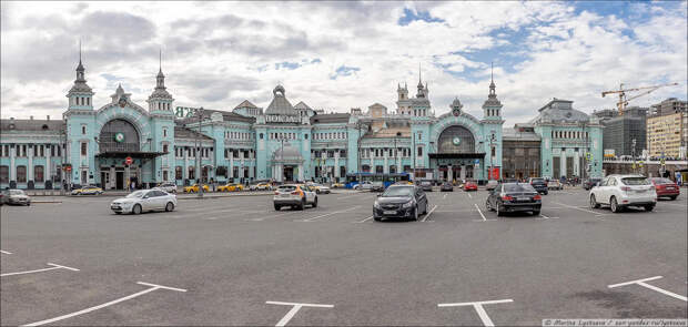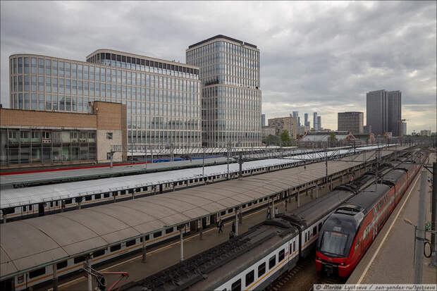 Фотопрогулка по летней Москве. Фотографии и текст Марины Лысцевой С пешеходного моста на «электрической» станции открываются виды на Москву в районе Пресни и Беговой. Аэроэкспресс, на котором мы приехали, уходит по прямой ветке в депо. Достроены новые «стекляшки» на Грузинском валу: Водонапорная башня в депо имени Ильича: прекрасно сохранившаяся готическая архитектура начала 20 века: На площади перед платформами скульптурная композиция «Прощание славянки»: Между зданием вокзала и входом в метро (кольцевая линия) строят пассажирский павильон площадью 550 кв.
