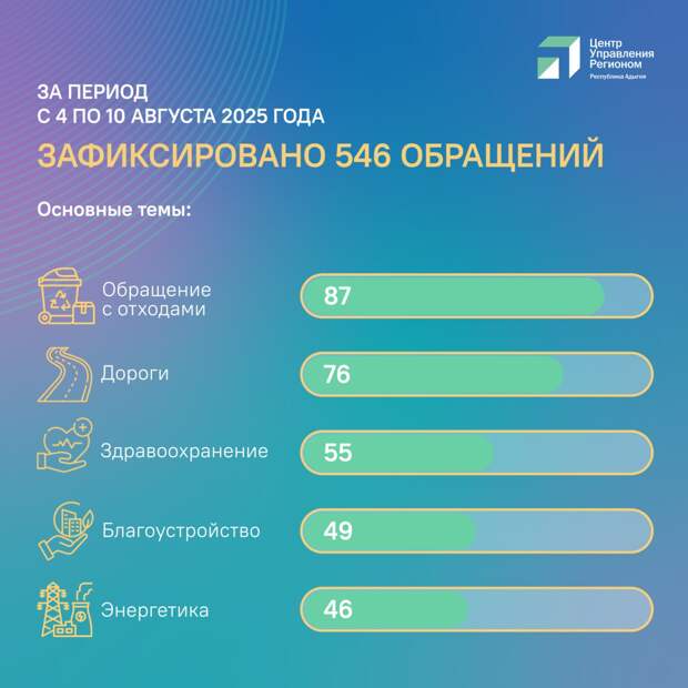 За минувшую неделю специалисты ЦУР Адыгеи зафиксировали 546 обращений к органам власти в различных сферах. Из них 302 уже обработаны, остальные находятся в процессе решения.