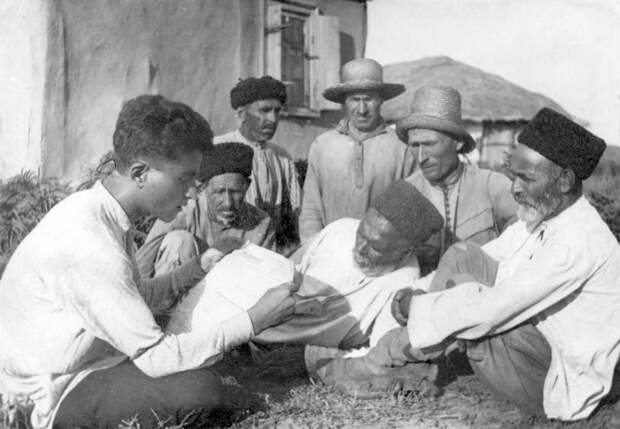 Студент З курса Московского института строительства Юсуф Кабанов читает колхозникам газету «Ударник» на родном языке. Аул Эдепсукай.