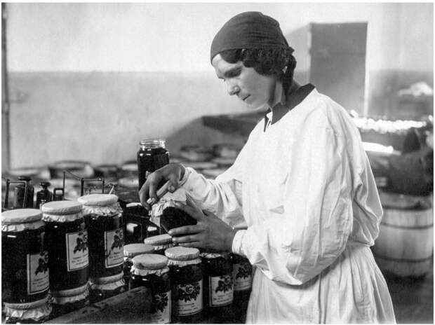 Стахановка Комиссарова во время работы на варенье-варочном заводе Майкопа, 1937 г.